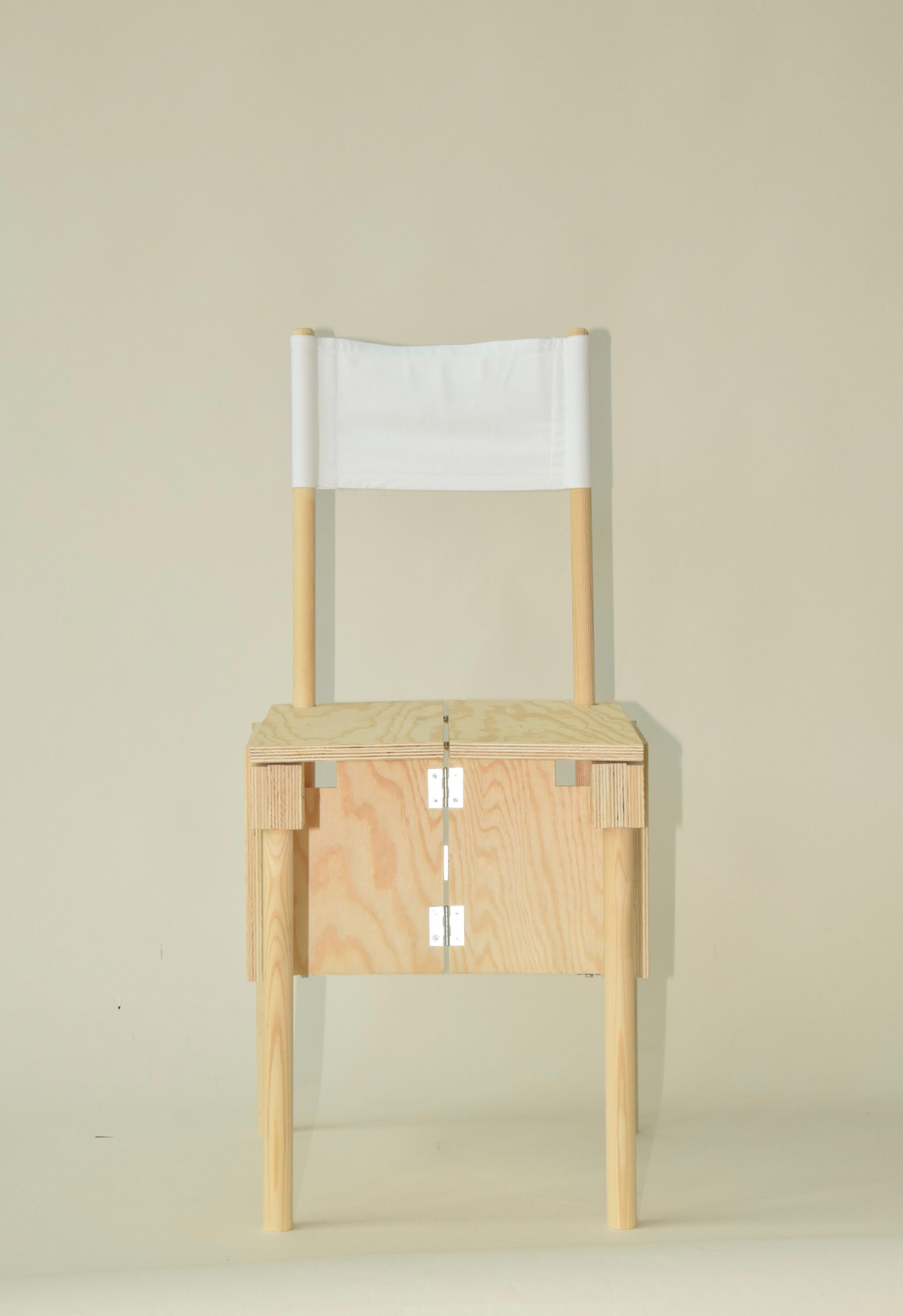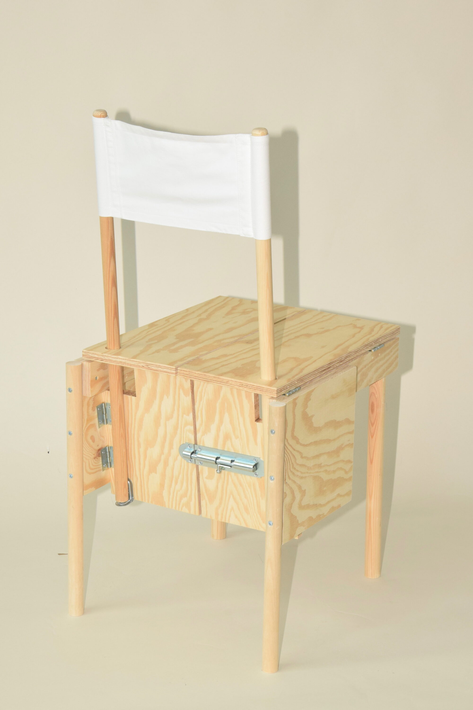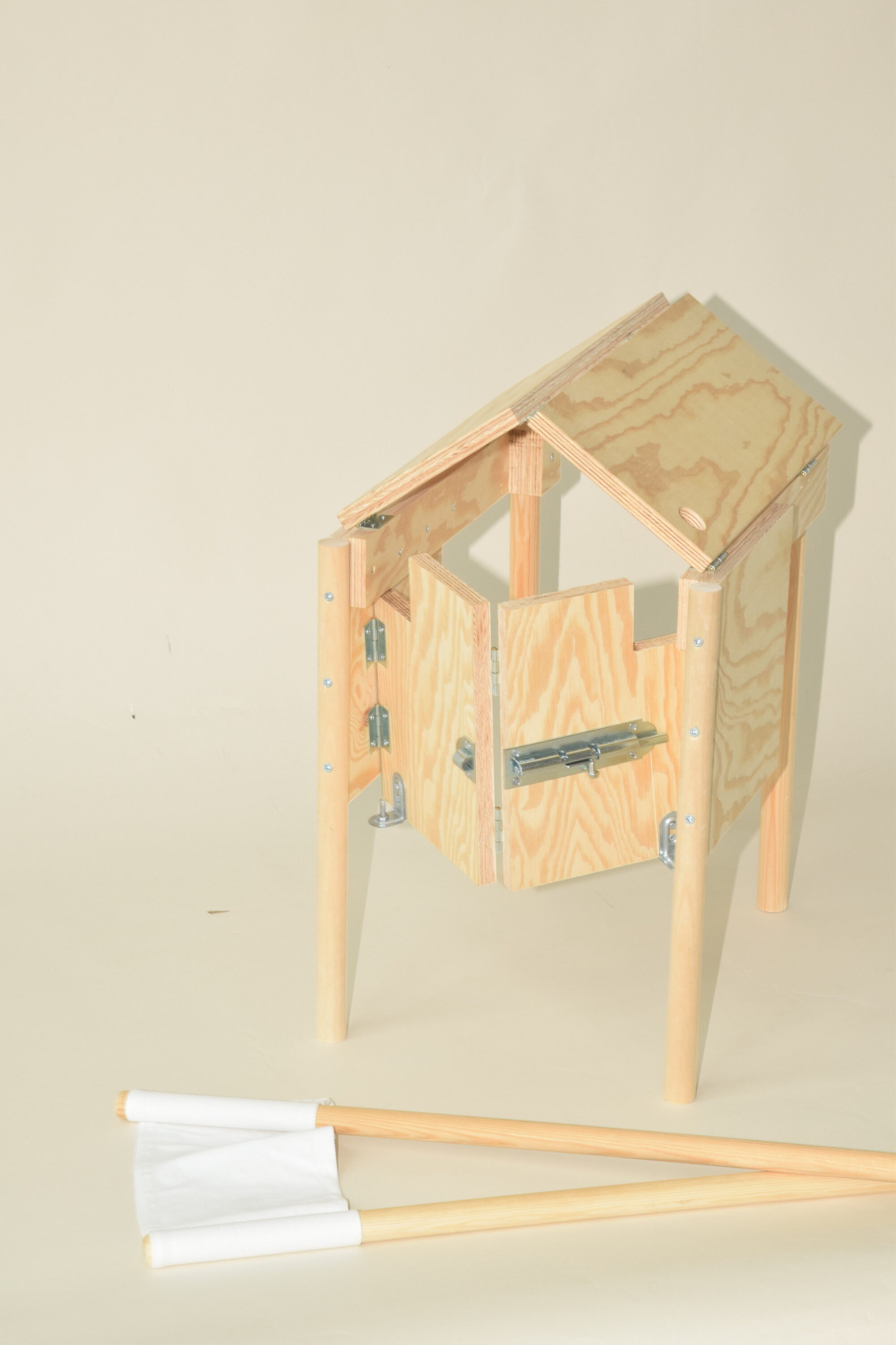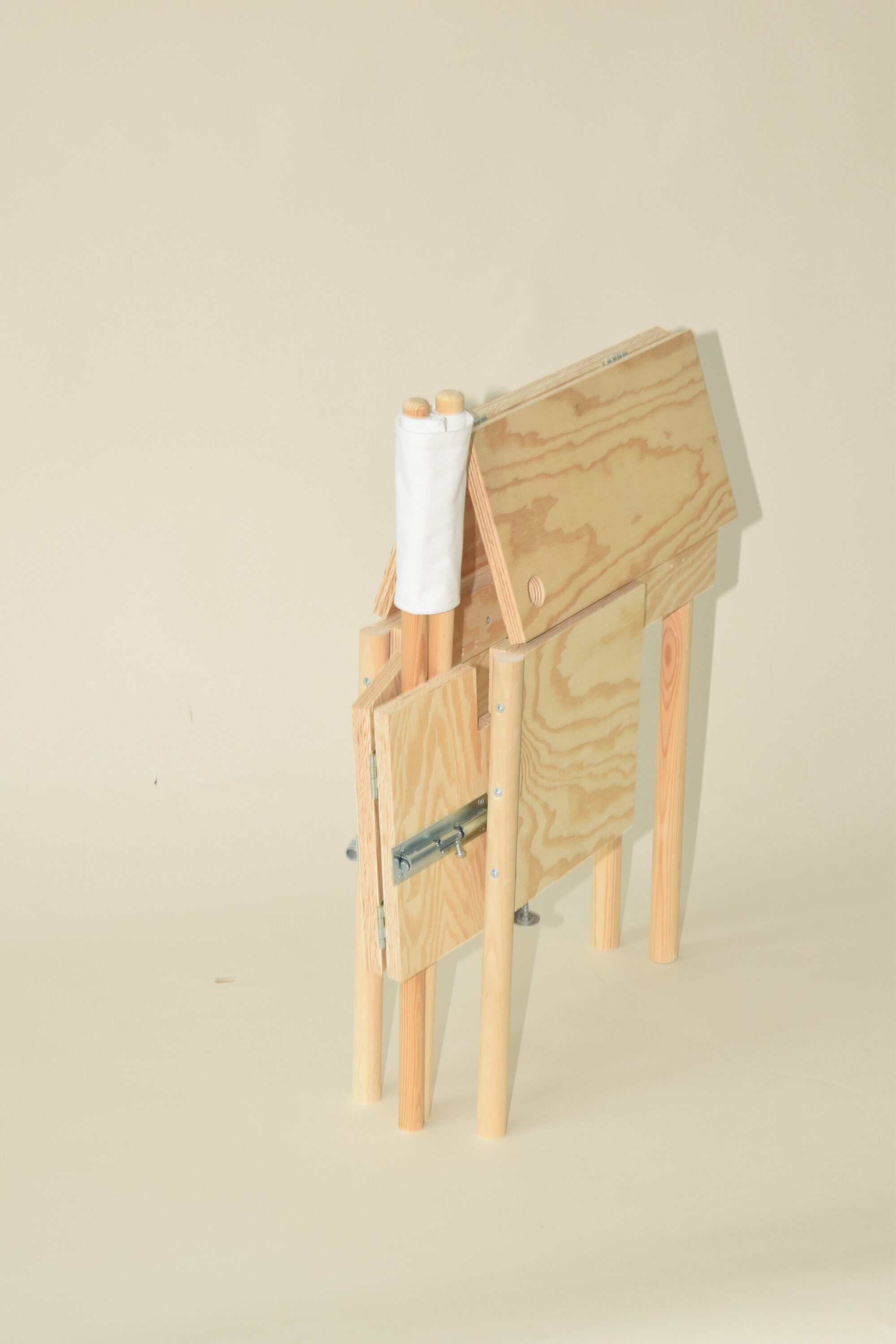 Found materials, pine plywood, pine roundbar, shirt textile, hinges.