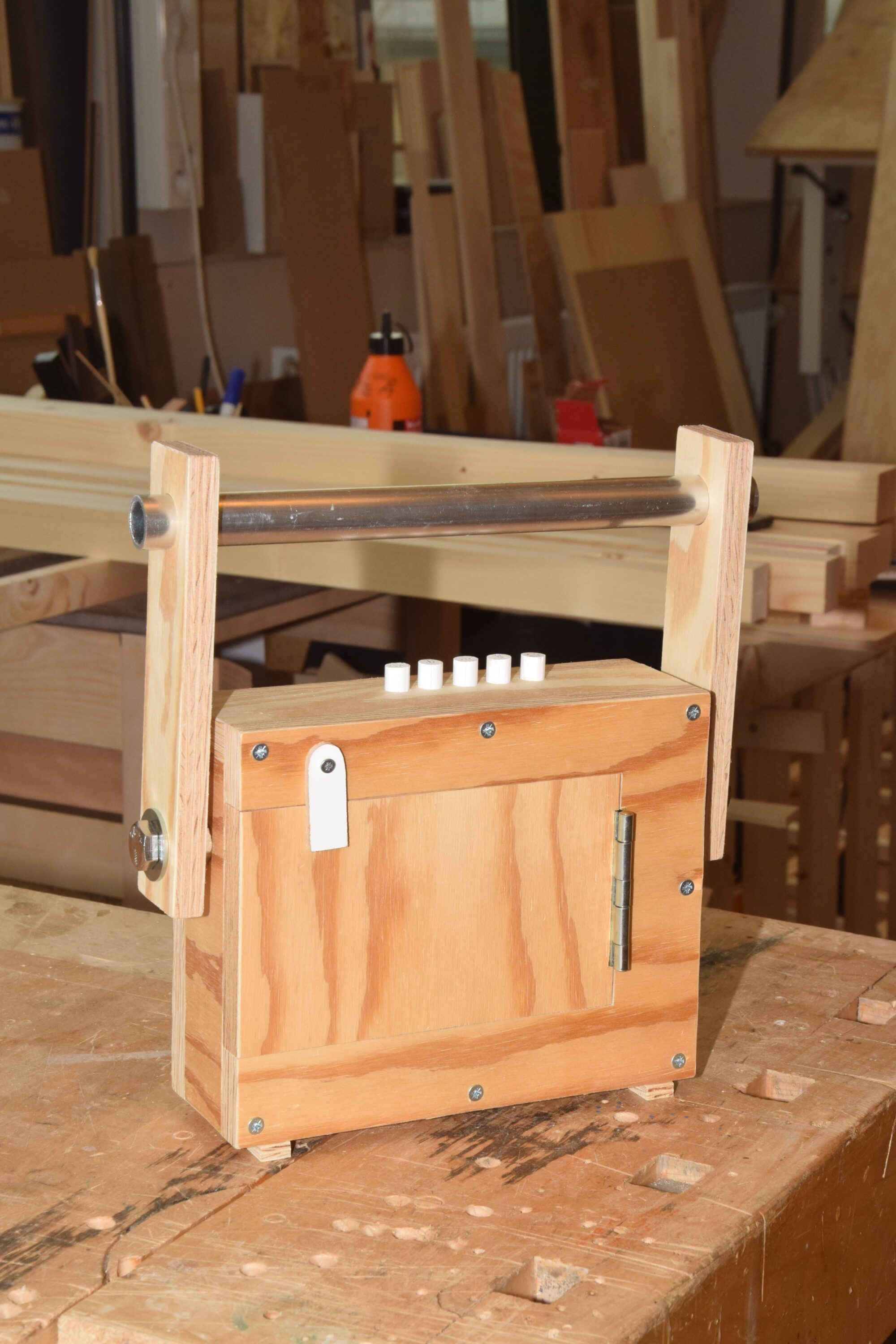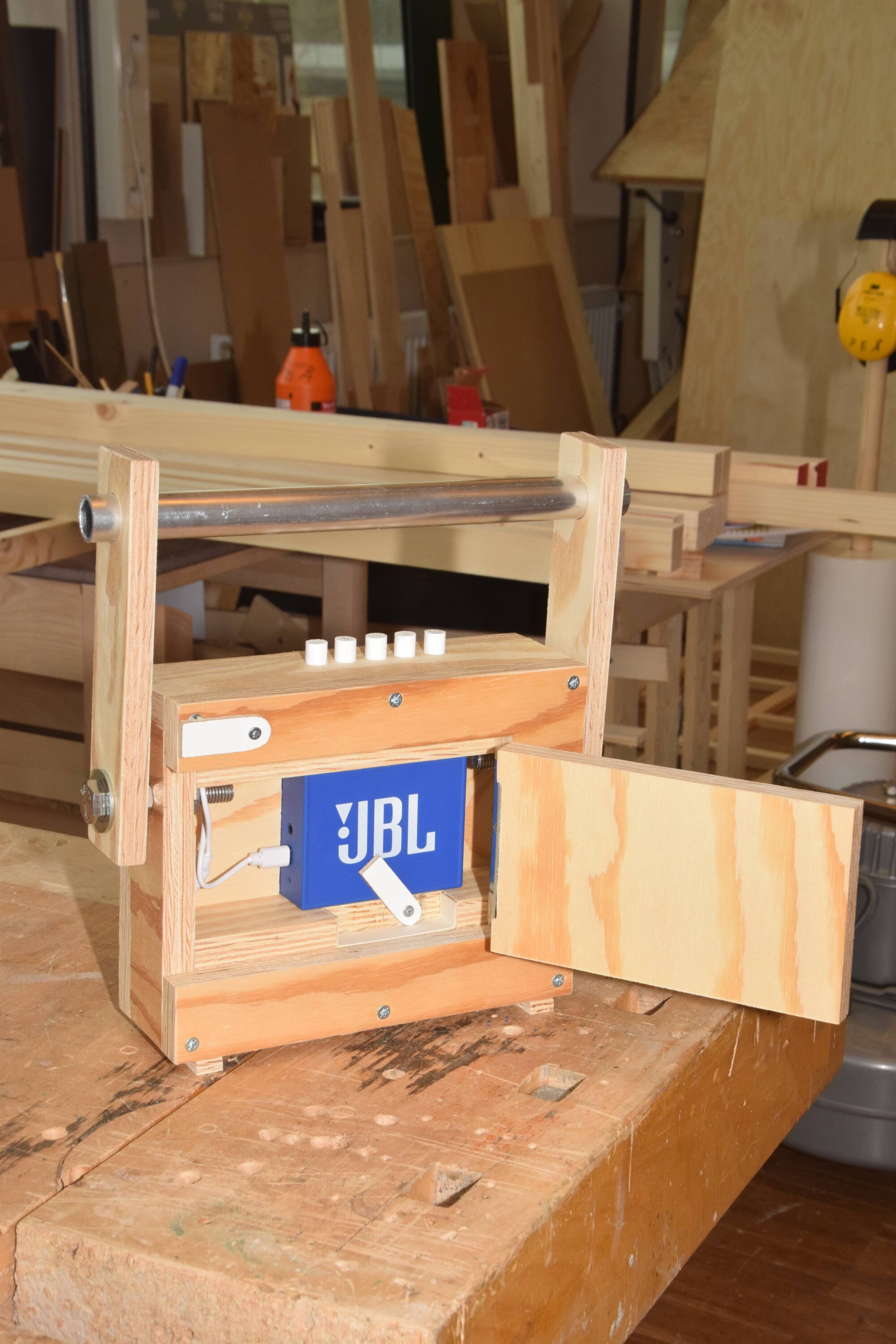 Wireless speaker with functioning wooden buttons.